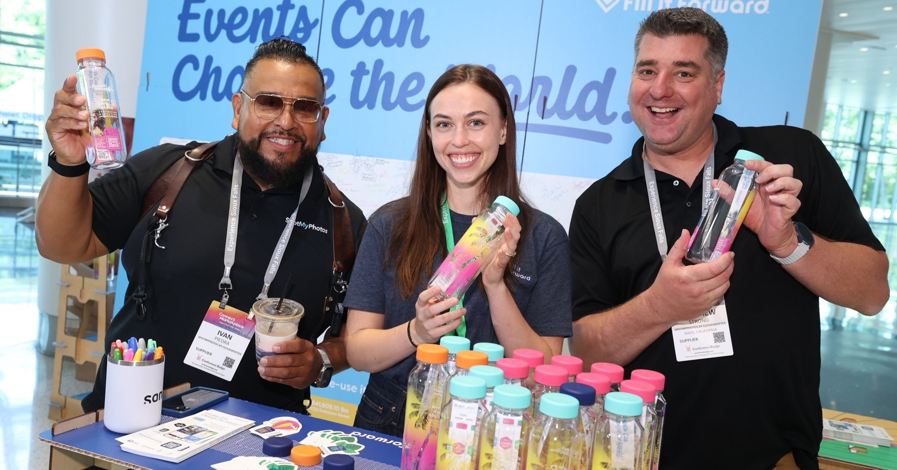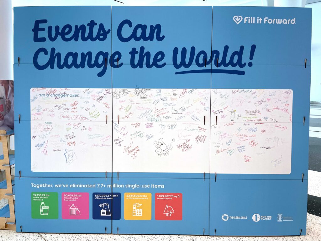 As part of the registration process, attendees are reminded to bring their own reusable bottles. For those who forget or want to join the movement, Fill it Forward provides a reusable bottle tied to a sustainability pledge. Attendees signed the pledge on our “Events Can Change the World” backdrop wall, to receive their bottle, making a conscious commitment to reducing single-use plastics.