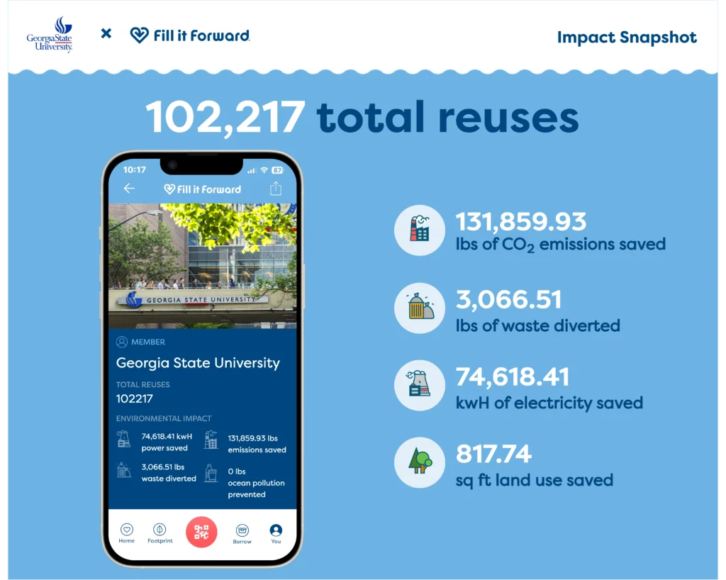By pairing their existing infrastructure with Fill it Forward’s Borrow tools, GSU built a highly efficient, accountable reuse program that delivers real results. The reuse data captured empowered the university to celebrate measurable progress while inspiring students to make everyday choices that collectively create meaningful change.