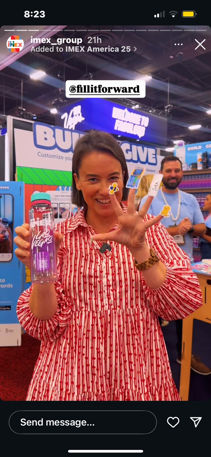 By combining water refill stations with Fill it Forward, IMEX offered a solution that was practical, memorable, and environmentally responsible. Guests left not only with a personalized keepsake but also with a tangible understanding of how small choices—like reusing a reusable water bottle—contribute to a larger sustainability mission.