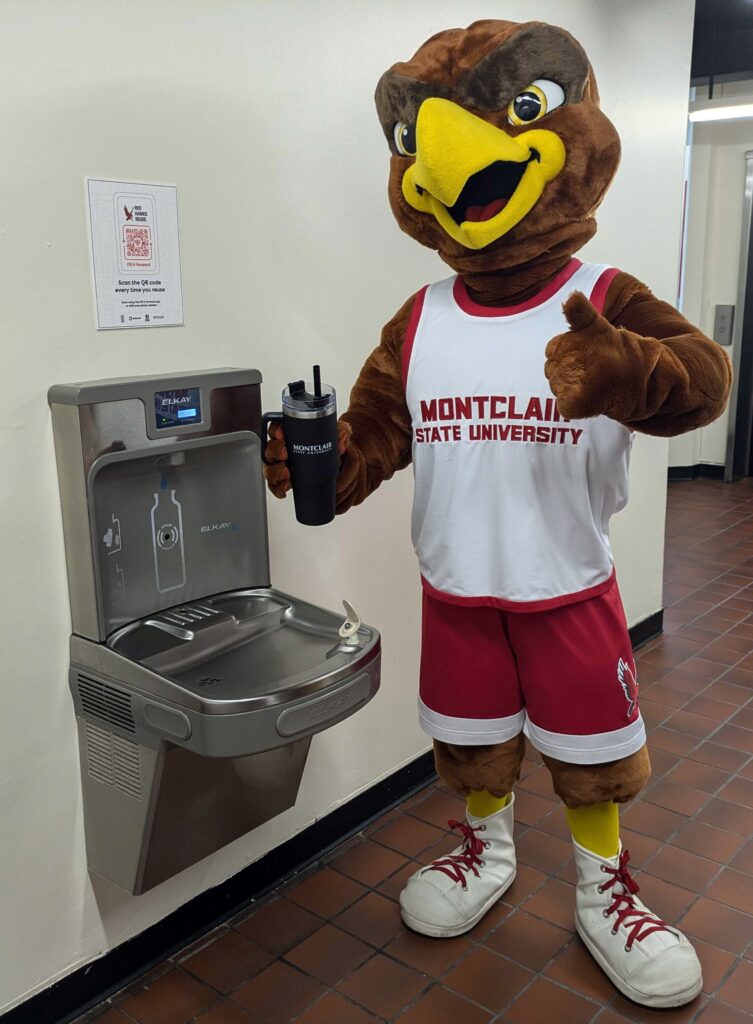 The cultural adoption of reuse was immediate. Orientation leaders introduced first-year students to the concept of tracking refills and reusing, reinforcing the message that every small action contributes to a larger impact. Rocky the Red Hawk, Montclair State University’s beloved mascot, became the face of sustainability on campus. From flyers to social media campaigns, images of Rocky refilling his bottle encouraged students to integrate environmental responsibility into their everyday lives.
