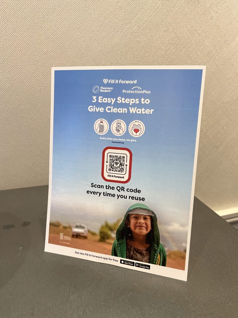 On site, posters placed next to water refill stations encourage attendees to stay hydrated, reuse often, and scan throughout the day. These simple visual cues prompt donations and allow attendees to check in on collective impact in real time, keeping participation easy and top of mind.