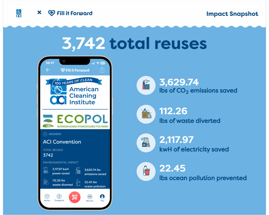 The American Cleaning Institute (ACI) partnered with Fill it Forward to turn everyday moments at the ACI Annual Meeting & Industry Convention into visible, shared impact. Rooted in American Cleaning Institute’s broader commitment to progress—outlined in its 2024 Sustainability Report—this collaboration brought sustainability to life in a way attendees could see, feel, and participate in firsthand. It’s a powerful example of how small, intentional actions can add up to meaningful change.
