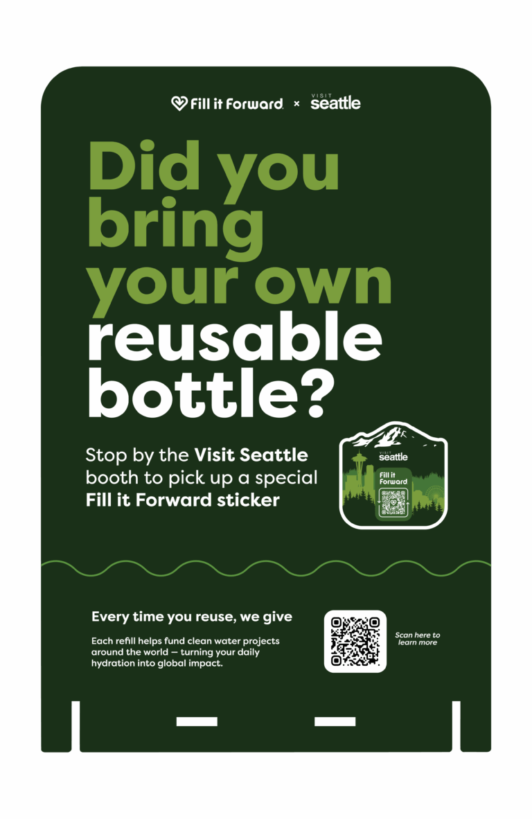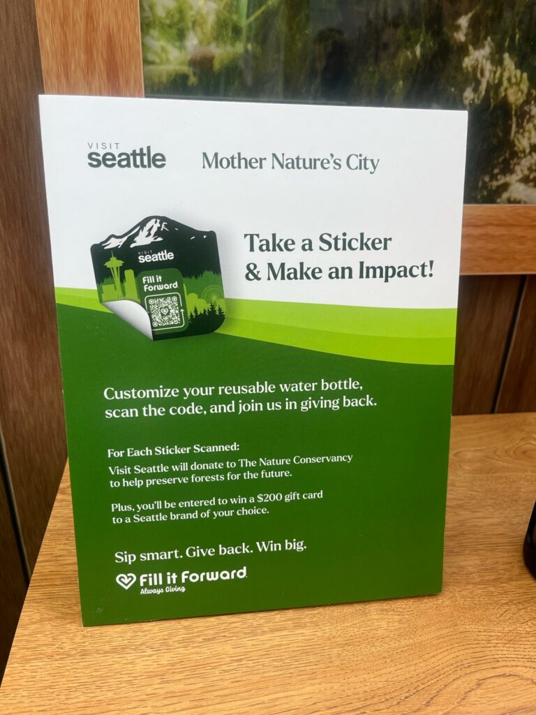 A highlight of the activation was the Fill it Forward sticker giveaway. Attendees who brought their own reusable water bottle were sent from the Fill it Forward Booth to Visit Seattle’s booth to pick up a special custom sticker. This small, purposeful giveaway is tied directly to sustainability, allowing attendees to take a stroll through the trees, chat with their team, and enter to win a giveaway.