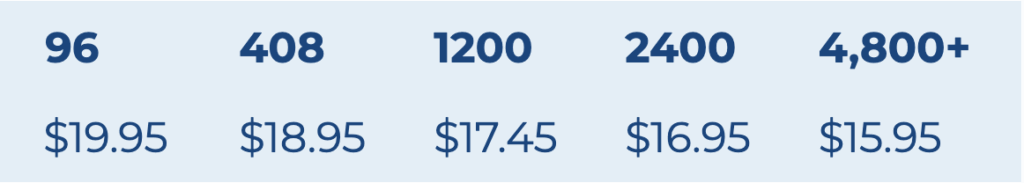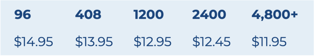 | 96 | 408 | 1200 | 2400 | 4,800+ |