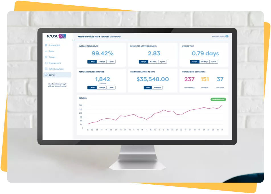 Start seeing 99% return rates with quick check-outs, reminders, and incentives that keep containers in circulation.